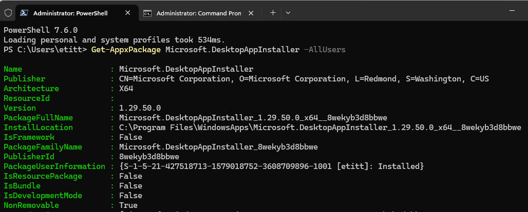 I then closed all terminal sessions and opened a fresh CMD tab to recheck winget –info. Unfortunately, the version remained 1.29.50-preview. Worse still, the missing icon issue persisted. To investigate further, I ran PowerShell as Administrator and executed Get-AppxPackage Microsoft.DesktopAppInstaller -AllUsers. The output showed only one package: version 1.29.50.0, marked as NonRemovable. Was I stuck?