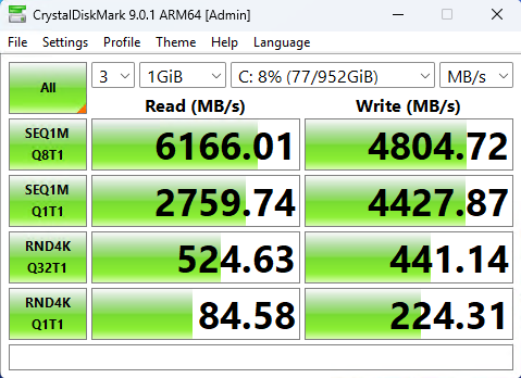 This is a peppy little PC. It blasts through a restart cycle (restart, boot, Windows startup, desktop) in 30-35 seconds right now. CrystalDiskMark shows decent but not killer numbers from the OEM Samsung MZVL81T0HDLB-00BLL 1TB PCIe x4 SSD: