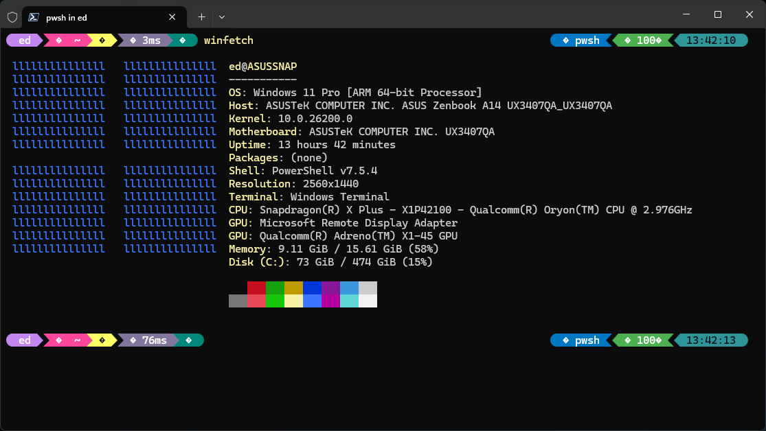 There are lots of interesting wrinkles that distinguish ARM-based PCs running Windows 11 from their Intel- or AMD-based counterparts. Nothing huge or deal-breaking. Just interesting and sometimes, mildy vexing. In setting up Windows Terminal and PowerShell “the way I like it,” I encountered just such a wrinkle. Indeed, my new ASUS Zenbook A14 AMR throws oh-my-posh curve that took some research to work around. The lead-in graphic shows where I started out.