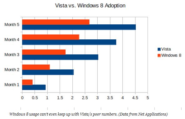 [Note added 3/5/2013: As I continued to ponder the “Win8 vs. Win7” decision I came across a ZDnet post from long-time OS expert Steven J. Vaughan Nichols which graphed the uptake of Windows 8 versus Windows Vista, each over the first five months since their respective introductions. Here’s the graphic he produced to present a stark and scary comparison: